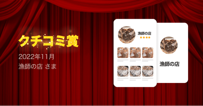 2022年11月度のクチコミ賞として、北海道茅部郡で噴火湾で採れる新鮮な海産物を販売している「漁師の店」様を選出いたしました。また準クチコミ賞を下記の通り選出しています。