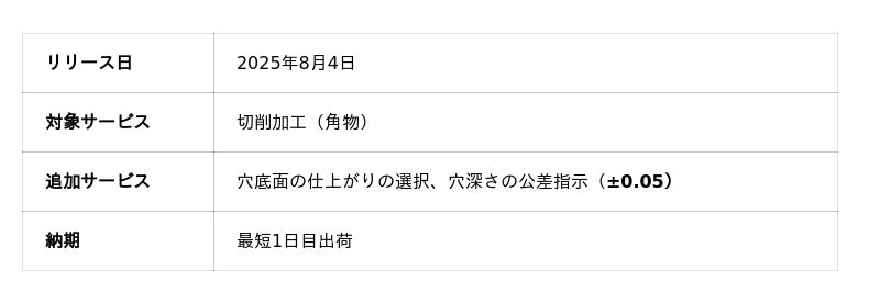 機械部品調達のAIプラットフォーム「meviy(メビー)」(サービス提供元:株式会社ミスミグループ本社)は、2025年8月4日より、切削加工(角物)(以下、切削角物)において、穴加工の指示範囲を拡大します。これにより、穴底面の仕上がり指定や穴深さの公差指示が可能となり、より高精度な部品設計が実現します。この機能強化により、自動車や油空圧機器、半導体機器など、組付け精度や機械的強度が求められる製品やシーンでの活用が期待されます。今後もミスミはサービスの向上を通して、IA(インダストリアル・オートメーション)産業のお客さまにグローバルで時間価値を提供、生産性の向上に貢献してまいります。