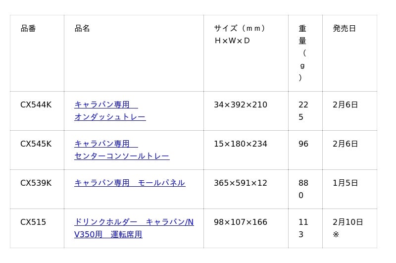 また、「ドリンクホルダー キャラバン/NV350用 運転席用」は、2026年2月より全国の量販店で発売を開始します(ECサイトでは2025年3月より発売済み)。各製品の発売日や製品特長などは以下よりご確認ください。