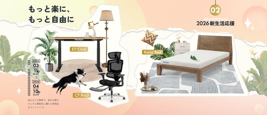 Flexispot Japan 株式会社Flexispot Japan株式会社(本社:埼玉県入間郡、代表取締役:斉冰白、以下「FlexiSpot」)は、2026年3月11日(水)より「新生活応援キャンペーン第2弾」を開催いたします。本キャンペーン期間中、新作の昇降デスク、オフィスチェア、ベッドフレームが登場し、数量限定の特別価格にてお求めいただけます。