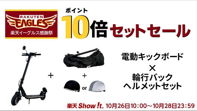 楽天市場「Show !t」は10月26日(水)20時開始、10,000円相当お得なMESTER.F電動キックボードとヘルメット・輪行バックセットを販売。秋晴れに電動キックボードで爽快な秋のお出かけを楽しもう。また、10月26日(水)10時~10月28日(金)23時59分まで開催される楽天イーグルス感謝祭に参加し、全商品送料無料でポイント10倍プレゼント(一部商品を除く)を実施します。