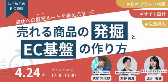 株式会社LEAGUE(本社:東京都)は、株式会社SUPER STUDIO、株式会社DGフィナンシャルテクノロジーと共同で、これからEC物販を始める方に向けた無料オンラインセミナー「はじめてのEC物販 成功への最短ルートを教えます 売れる商品の発掘とEC基盤の作り方」を2025年4月24日(木)に開催します。