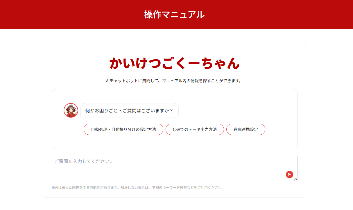 株式会社GoQSystemクラウド型通販一元管理システム「GoQSystem(ごくーシステム)」を運営する株式会社GoQSystem(本社:東京都中央区、代表:藤本 卓治、以下「当社」)は、ユーザー向けマニュアルページにおいて、AIアシスタント「かいけつごくーちゃん」を新たに搭載いたしました。EC運営の多忙な現場において、操作方法の確認に要する時間は大きな課題です。