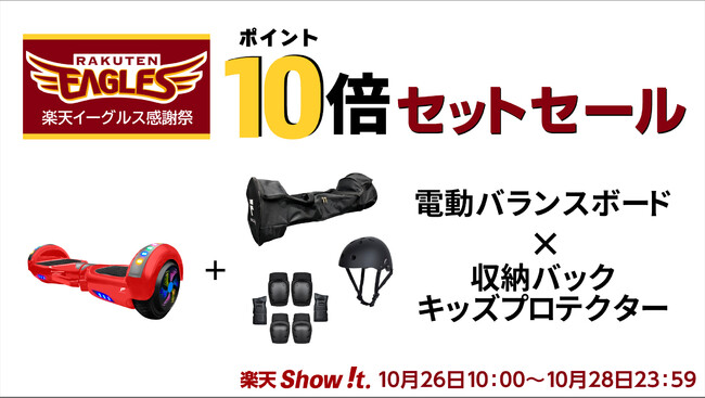 楽天市場「Show !t」は10月26日(水)10時開始、MEISTER.Fの電動バランスボードをご購入すると、購入後届いたらすぐにバランスボードを練習できる10,000円相当のキッズプロテクターと収納バックセットをプレゼントします。バランスボードは重心移動で運転をコントロールする楽しいモビリティ、秋の外遊びにおすすめです。また、10月26日(水)10時~10月28日(金)23時59分まで開催される楽天イーグルス感謝祭に参加し、全商品送料無料、ポイント10倍プレゼント(一部商品を除く)を実施します。