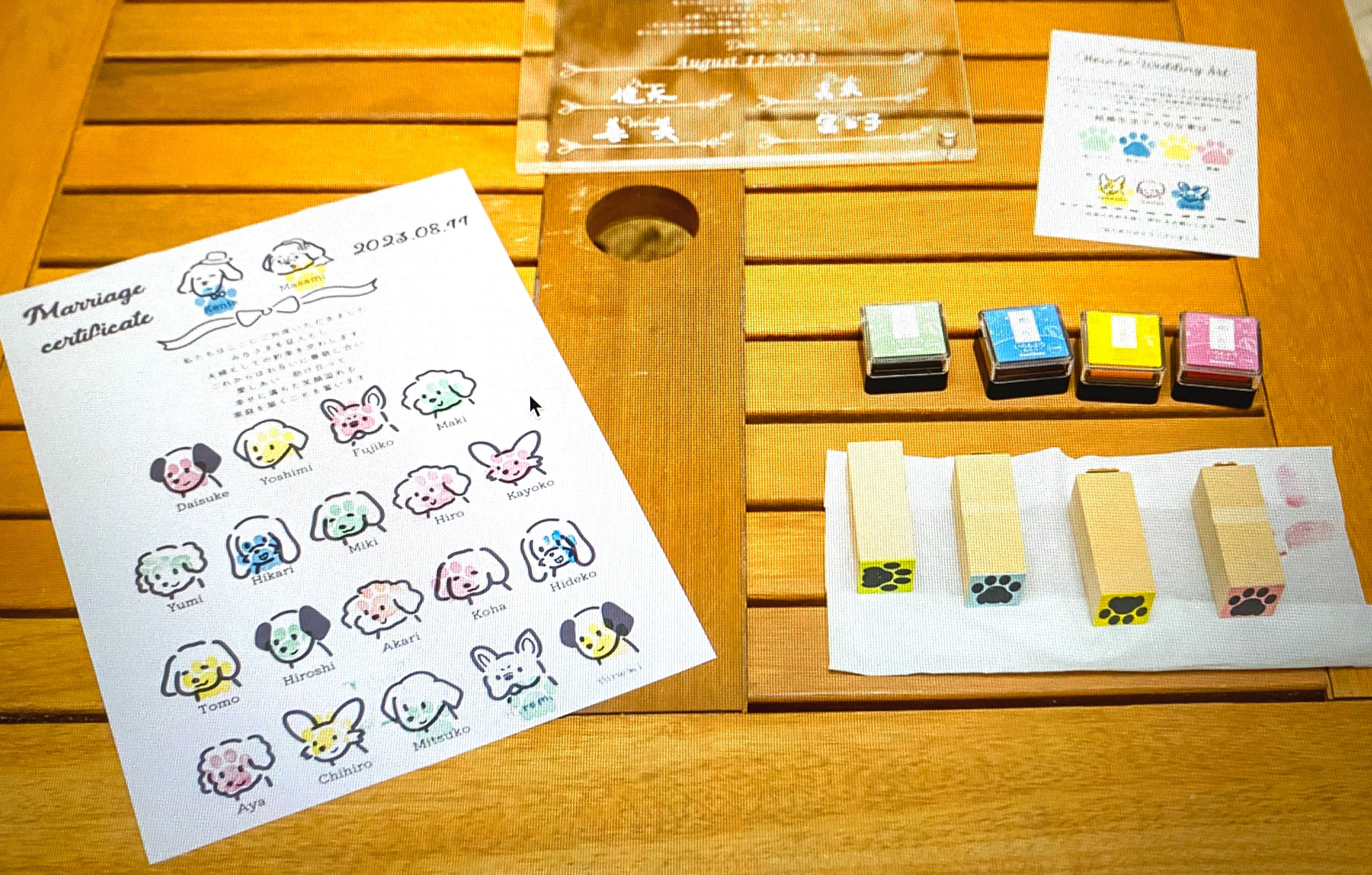 出席者が犬イラストに!オンリー“わん”な結婚証明書2人とも犬好きなので、「犬種の指定や表情まで細かく対応してくださる」という口コミに惹かれました。おかげさまで作品の仕上がりはもちろん大満足。式当日は小さな子ども達もとても楽しんで証明書づくりに参加してくれました。もなく完成予定の新居に、この証明書を飾るのが楽しみのひとつです。