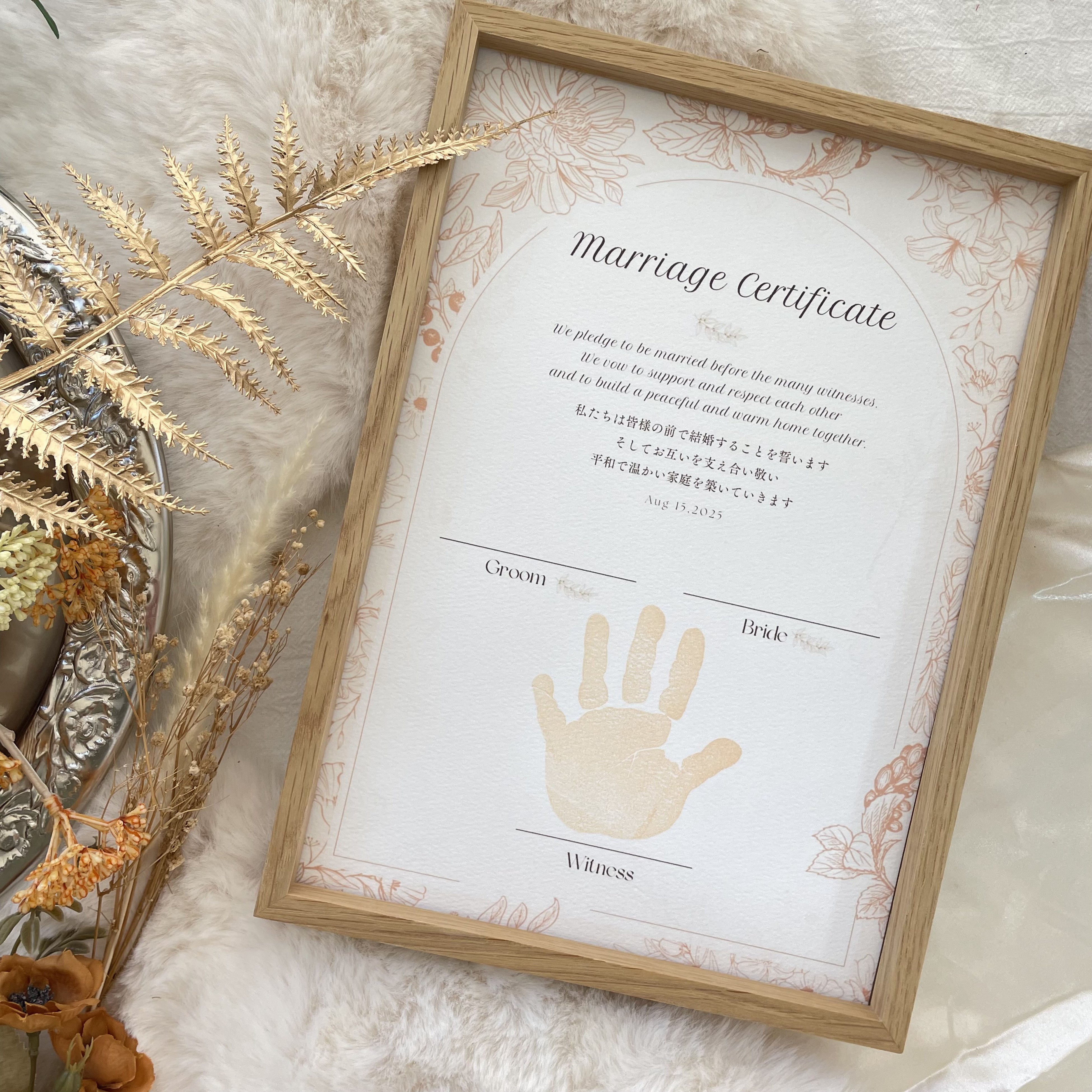 赤ちゃんの手形を取り入れて仕立てる、パパママ婚に寄り添う結婚証明書。家族のかたちに合わせて内容を相談しながらオーダーでき、今しか残せない記念をかたちにできます。