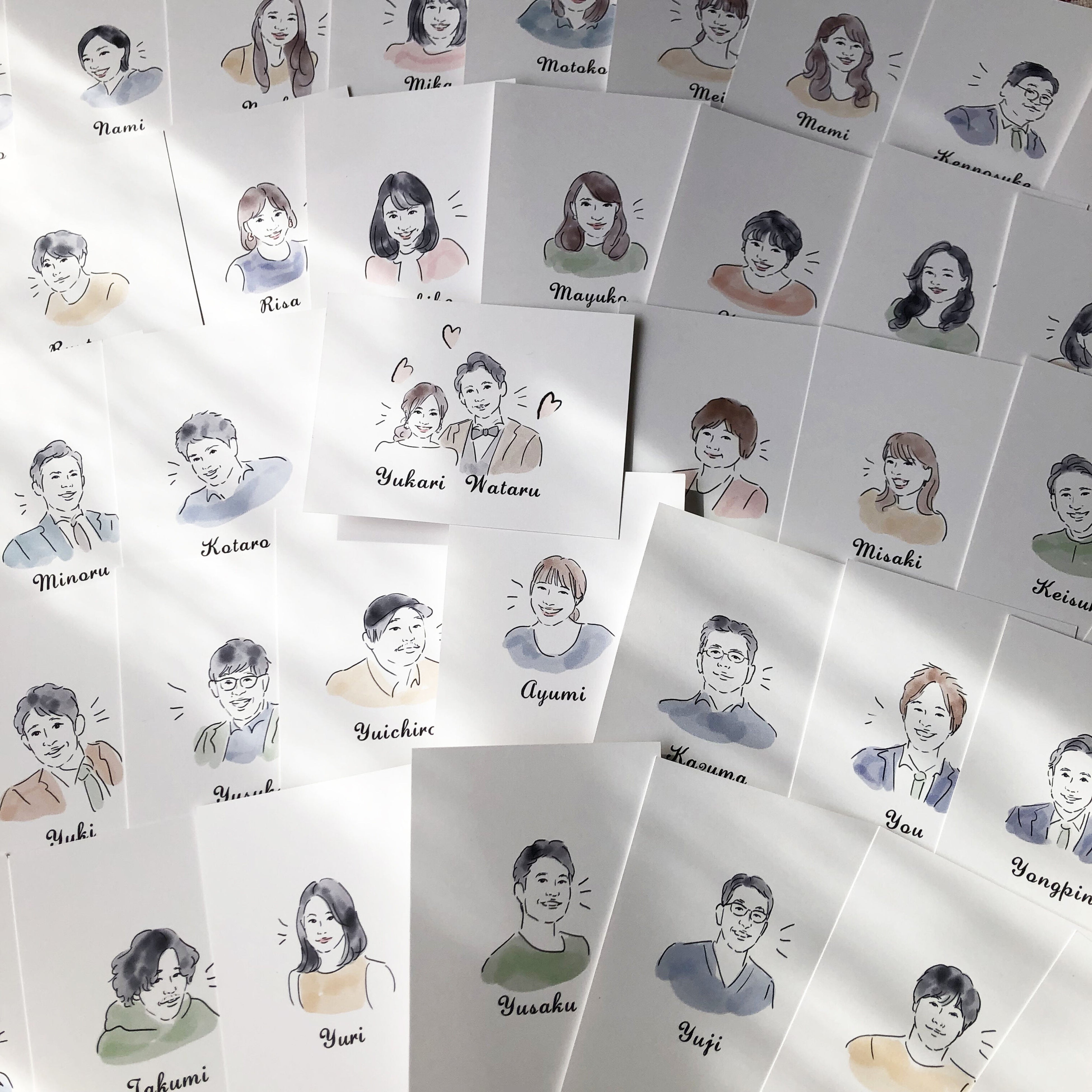 出席者一人ひとりの特徴を丁寧に捉えた、シンプルであたたかみのある似顔絵席札。表情や雰囲気を相談しながらオーダーでき、結婚式後も手元に残したくなるギフトとしても人気です。