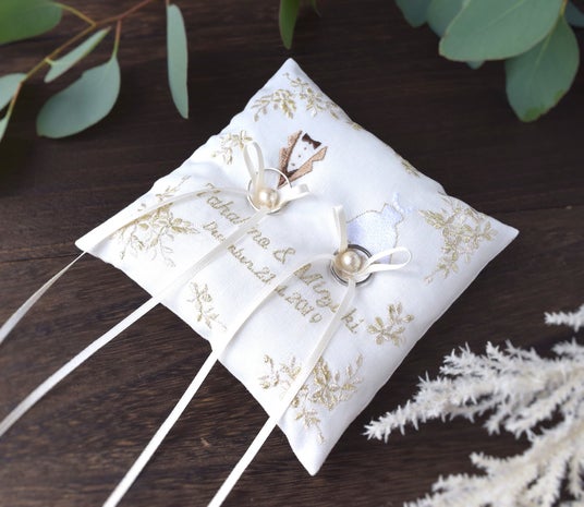 名前や日付を刺繍で入れられる、特別感のあるリングピロー。結婚式後も記念として大切に残しておける作品です。