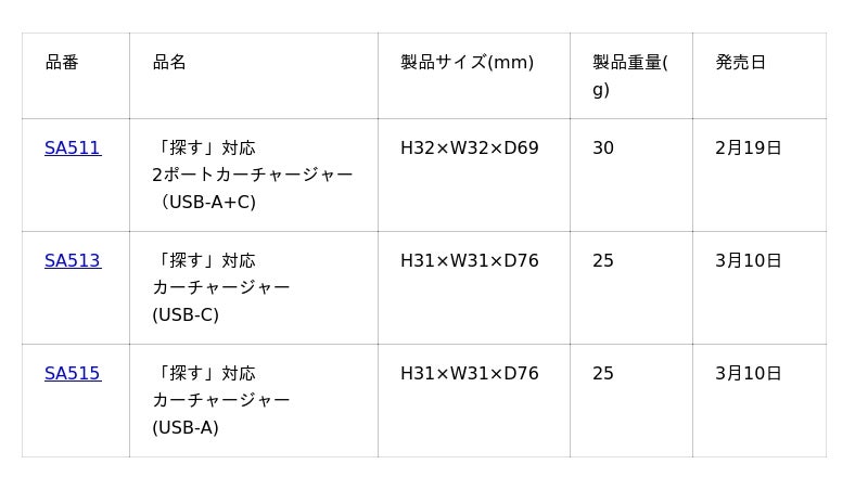 “「探す」対応 カーチャージャー”を、2026年2月~3月にかけて順次発売いたしました。本製品を車のシガーソケットに挿すだけで、手元のiPhone「探す」アプリから、車の位置が確認可能に。また、キャパシタを搭載しているため、エンジン停止後も約1週間「探す」機能が継続して作動します。対応ポートの違いにより3種類をラインアップしました。マイカーだけでなくカーシェアなどを利用する際も、スマートフォンへのスムーズな充電と駐車位置の確認をサポートします。各製品の発売日や詳細は以下をご覧ください。
