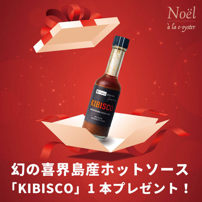 また、『クリスマス特別セット』をご購入いただいたお客様には、もれなく幻の喜界島産ホットソース「KIBISCO」をプレゼントします。鹿児島県奄美群島にある喜界島の「きび酢」と赤唐辛子で作る「KIBISCO」は、まろやかな辛さと程よい酸味が「e-oyster」の生牡蠣の旨みを引き立て、より美味しくお召し上がりいただけます。