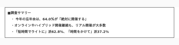「長時間楽しみたい人は残ってワイワイ」「先に帰る人は1缶だけでサクッと乾杯だけ」というように、企業側が忘・新年会への参加スタンスの選択肢を柔軟にすることが求められていると感じています。また、コミュニケーションの重要性を示す前に、「今年もありがとう」という勤労の感謝を込めた企業側からのおもてなしを第一に、社員が参加自体を気負いしない形式を考える必要があると思います。