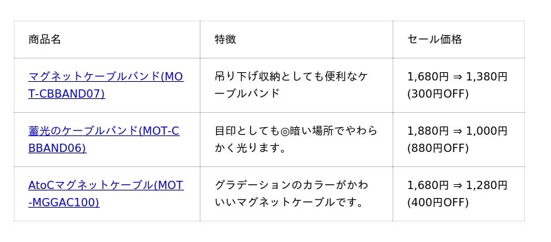 MOT-MGSAC1001,480円 ⇒ 1,000円(480円OFF)USB-CもLightningも充電したいという方にピッタリの2in1ケーブルです。