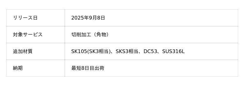 機械部品調達のAIプラットフォーム「meviy(メビー)」(サービス提供元:株式会社ミスミグループ本社)は、2025年9月8日より、切削加工(角物)(以下、切削角物)において、材質ラインアップを拡充します。今回新たに追加する材質は、SUS316Lおよび焼入れ材3種(SK105(SK3相当)・SKS3(相当)・DC53)です。これにより、耐食性が必要な部品や焼入れ材の選択肢が広がり、設計意図に沿った部品をこれまで以上にmeviyで効率的に調達が可能となります。今後もミスミはサービスの向上を通じて、IA(インダストリアル・オートメーション)産業のお客さまにグローバルで時間価値を提供、生産性の向上に貢献してまいります。