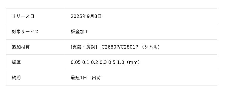 機械部品調達のAIプラットフォーム「meviy(メビー)」(サービス提供元:株式会社ミスミグループ本社)は、2025年9月8日より、板金加工サービス(以下、板金部品)で真鍮(シム用)を新たに追加します。板金部品では初の銅材質追加となり、導電性・非磁性が求められるシムプレートやスペーサーや電子機器への対応が可能となります。今後もミスミはサービスの向上を通して、IA(インダストリアル・オートメーション)産業のお客さまにグローバルで時間価値を提供、生産性の向上に貢献してまいります。