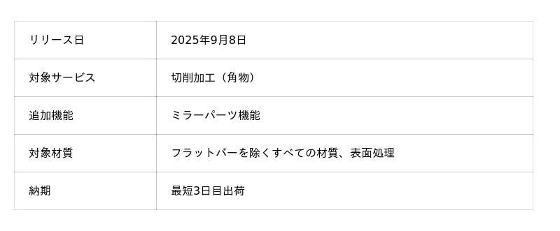機械部品調達のAIプラットフォーム「meviy(メビー)」(サービス提供元:株式会社ミスミグループ本社)は、2025年9月8日、切削加工(角物)(以下、切削角物)において、「ミラーパーツ機能」を新たに搭載しました。本機能により、左右反転した部品(ミラーパーツ)をワンクリックで自動見積もり・発注が可能となり、設計者の工数が削減されます。今後もミスミはサービスの向上を通して、IA(インダストリアル・オートメーション)産業のお客さまにグローバルで時間価値を提供、生産性の向上に貢献してまいります。