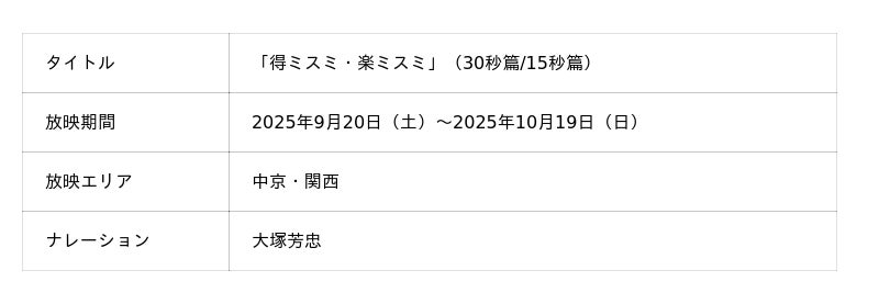 株式会社ミスミグループ本社(本社:東京都千代田区、代表取締役社長:大野龍隆)は、2025年9月20日(土)より、製造業で設備設計に携わる皆さまに向け、新CM「得ミスミ・楽ミスミ」編(30秒/15秒)を「ものづくり」の中心地である関西・中京エリアにて放送します。CM映像は、ミスミ公式YouTubeチャンネルでも同時公開します。