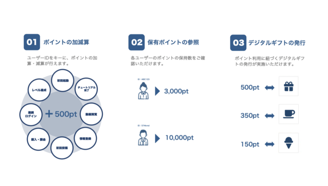 ■「giftee Point Management API」概要 自社WEBやアプリ上にポイントサービスの仕組みをスムーズに導入することができるAPIです。ご用意いただいたWEB画面、アプリ上に本APIを連携いただくことで、ユーザーIDに紐づき、ユーザーのアクションに準じたポイント加減算とポイント管理、インセンティブ付与、ポイント交換の対象としてデジタルギフトの発行まで一気通貫で行うことができます。
