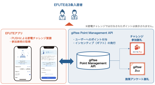 また昨今、全国的な電力需給逼迫、ならびに電気料金含む物価高騰を受けて、経済産業省から冬の「節電ポイント」プログラムへの積極的な参加が呼びかけられるなど、全国の電力会社にとって、「節電ポイント」を契機としたポイントプログラムやサービスの導入および、それに付随するDXの加速が期待されています。このような動向を踏まえ、ギフティでは、mui Labが提供する節電プログラム対応アプリ「mui Kurashiアプリ」と連携し、「giftee Point Management API」の「節電ポイント」プログラムへの対応もあわせて開始しております。「mui Kurashiアプリ」は、マンション管理会社からのお知らせの受信や、マンション内の温湿度表示、熱中症アラート、部屋内見守りといった機能などを備えたスマートホーム対応アプリです。本ソリューション連携では、各電力会社のニーズに応じたアプリのカスタマイズが可能であり、契約者が賢く電力使用量を制御することで、電力需給バランスを調整するための仕組みであるデマンド・レスポンス(DR)の機能を利用して、電力会社からの節電依頼に応諾した家庭に対して「giftee Box(R)」や「えらべるPay(R)」といったデジタルギフトや、電子マネーなどに交換できるポイントを即時で付与することが可能です。なお、本ソリューションの初号案件である北ガスライフロントの「節電チャレンジ」は、入居者とのエネルギーを中心とした双方向コミュニケーションの促進を目的としており、同社の賃貸住宅「EFUTE(エフュート)北3条」の入居者専用アプリ「EFUTEアプリ」(※7)上で実施されました。