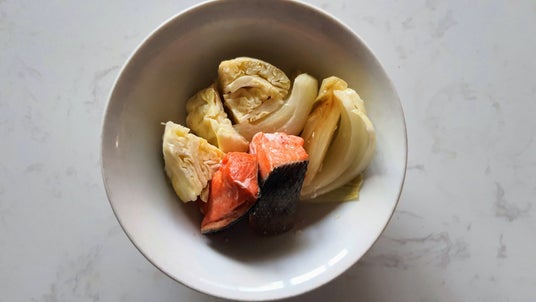 1.塩鮭は1/3、キャベツと新玉ねぎは大き目のざく切りにする。