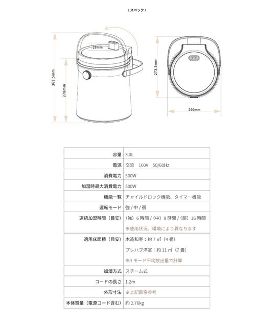 しかも、スチーム式は沸騰させたお湯の蒸気で潤すため、雑菌が繁殖しにくくメンテナンスは簡単。フィルターレスだから長期保管前のお手入れもあっという間に完了します。