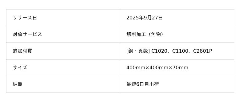機械部品調達のAIプラットフォーム「meviy(メビー)」(サービス提供元:株式会社ミスミグループ本社)は、2025年9月27日より、切削加工(角物)(以下、切削角物)で銅および真鍮の自動見積もりを開始しました。切削角物では初の銅系材質となり、導電性・放熱性が求められるバスバーや放熱板などへの対応が可能となります。