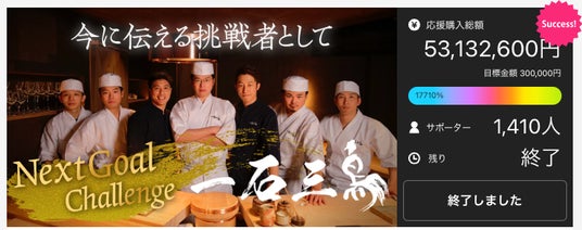 立ち上げ当初から「Makuake」を利用してプロジェクトを実施し、沢山の新規顧客に一石三鳥という店舗を知ってもらい、「Makuake」を通して新店舗オープン前にして、会員様から応援購入をいただいております。