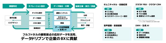 ELYZAの生成AI技術をコンタクトセンターデータに適用し、顧客の状況に合わせたチャネルの最適化や対話要約などによる事務処理の短縮化・品質均質化を実現します。また、生成AI技術を活用した情報抽出、分類などにより、VoC分析への活用も実現します。成形されたデータをフライウィールが提供する、プライバシー保護とデータ活用を両立するプラットフォーム「Conata (コナタ)(R) 」を活用して、CDP(Customer Data Platform)・購買などデータも統合した分類・相関分析を行い、課題特定から改善施策の立案、目的に合わせたAI技術の活用、オペレーション設計、運用までのデータドリブンな企業活動を支援します。