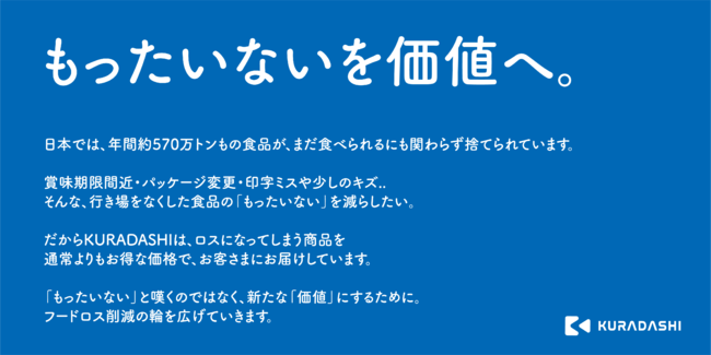https://www.kuradashi.jp/support【2022年3月末現在の主な累計実績】・フードロス削減数:18,632トン ・経済効果:67億876万円