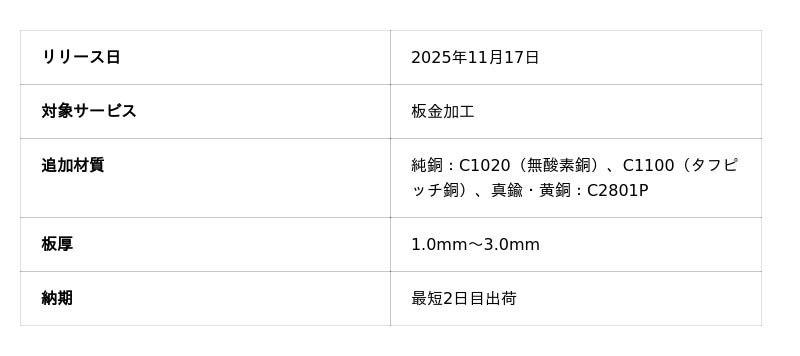 ※プレスリリース 「板金加工 真鍮(シム用)を追加」(2025年9月8日)