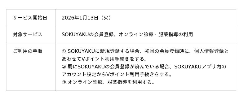 この度の取り組みにより、2026年1月13日(火)から、オンライン診療アプリ「SOKUYAKU」で新規会員登録を行い、オンライン診療・服薬指導をご利用いただいた方には、Vポイントが貯まるようになります。「SOKUYAKU」で貯めたVポイントは、全国約16万店舗のVポイント提携先や、世界の約1億店舗のVisa加盟店(※1)でご利用いただけます。