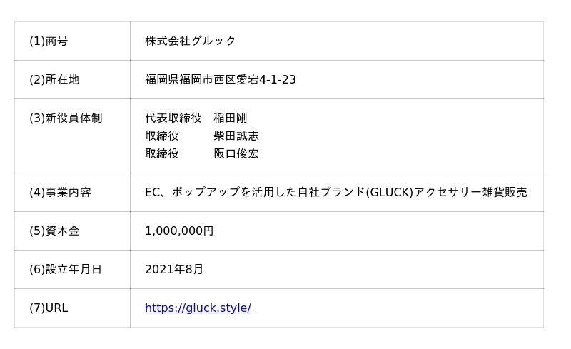 当社の連結子会社である株式会社トライフォース(本社:東京都中央区、代表取締役:稲田 剛)は、2025年12月10日付で締結した株式譲渡契約に基づき、本日、アクセサリーブランド「GLUCK」を展開する株式会社グルック(本社:福岡県福岡市、代表取締役:柴田 誠志 以下、「グルック」)の全株式を取得し、完全子会社化いたしましたので、お知らせいたします。