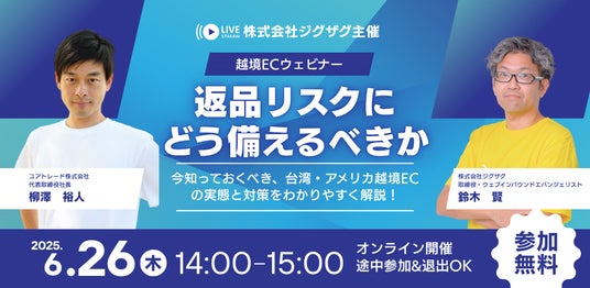 WorldShopping BIZを提供する株式会社ジグザグ(本社:東京都渋谷区、代表取締役:仲里一義)は、ユアトレード株式会社(本社:東京都渋谷区、代表取締役:柳澤裕人)をお招きし、「返品リスクにどう備えるべきか~今知っておくべき、台湾・アメリカ越境ECの実態と対策をわかりやすく解説!」無料オンラインセミナーを、2025年6月26日(木)に開催いたします。