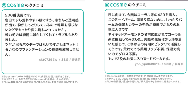 2.@cosme SHOPPINGのコンテンツ (1)生活者のリアルな声をお届けする「@cosmeに投稿されたクチコミ」@cosme に投稿されたクチコミの一部を、@cosmeが選定して本ストアに掲載します。実際に商品を使った生活者のリアルな声によって商品への理解が高まり、購入判断のヒントになります。