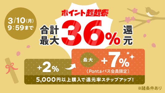 ■「ポイント超超祭」概要1.au PAY マーケット特典(https://wowma.jp/event/cho2_festival/index.html)(1)ポイント還元 キャンペーンページからエントリーの上、au PAY マーケットでお買い物いただくと、購入金額や条件に応じて最大7%のPontaポイント(au PAY マーケット限定)を還元します。買い得メンバーズの特典と店舗からのポイント還元をあわせることで、最大36%のポイント還元となります。