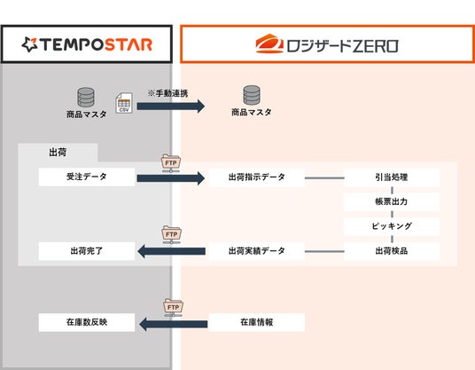 連携概要「TEMPOSTAR」と「ロジザードZERO」の自動連携により、注文情報・出荷実績・在庫数が自動で反映されるようになります。これにより、在庫の正確な把握・業務の効率化が可能となります。