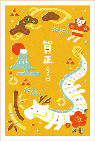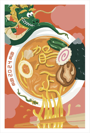 竜といえばラーメンどんぶり! ということで、寒い時期にぴったりのアツアツラーメンのデザインにしました。ラーメンに浮かび上がる「賀正」の文字がポイントです。みなさまの辰年が素敵な一年になりますように!