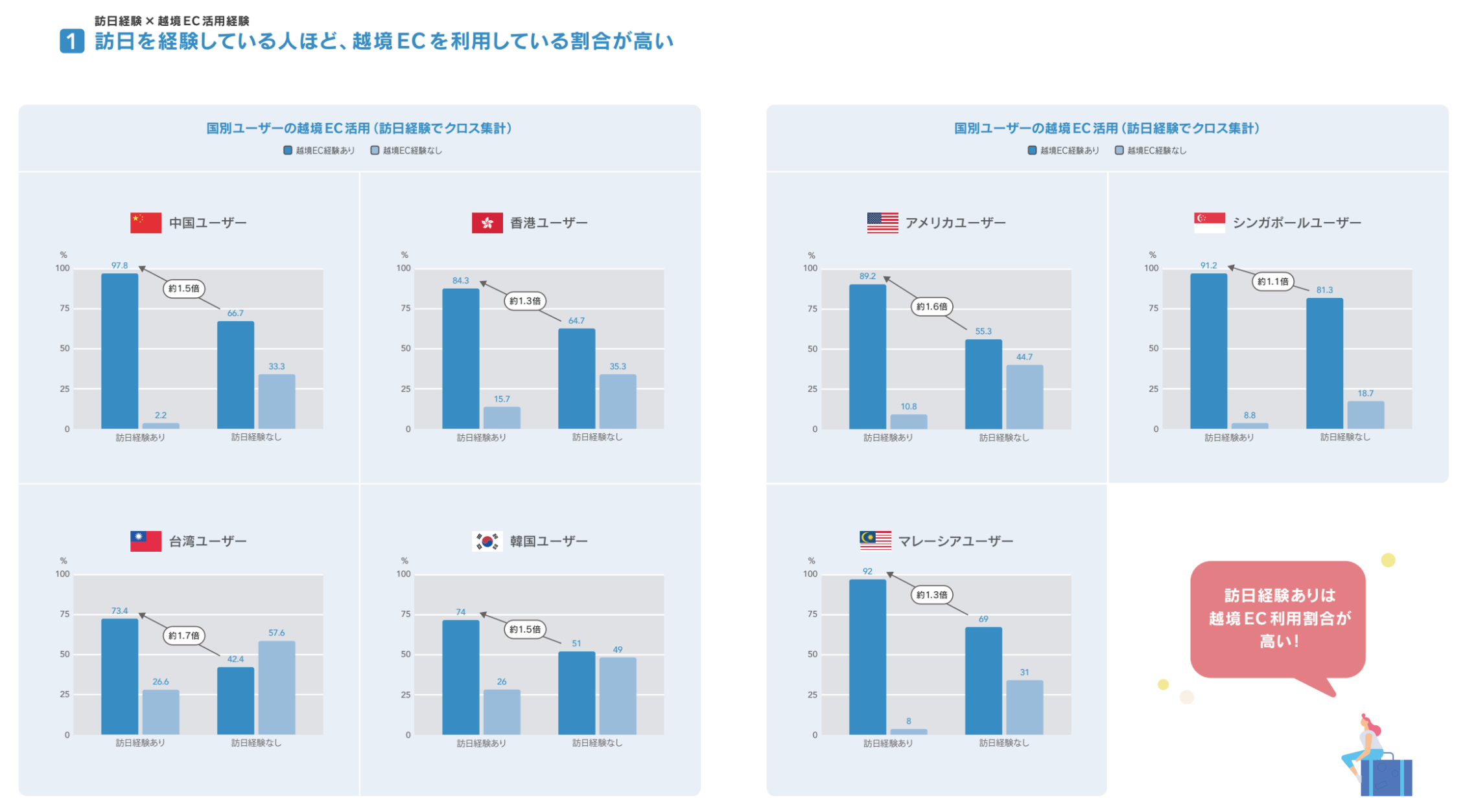 越境EC・ウェブインバウンド(R)︎白書 2025」では、調査対象の7カ国(中国、香港、台湾、韓国、アメリカ、シンガポール、マレーシア)すべてで「訪日経験あり」のほうが、越境EC活用の割合が高いことがわかっています。