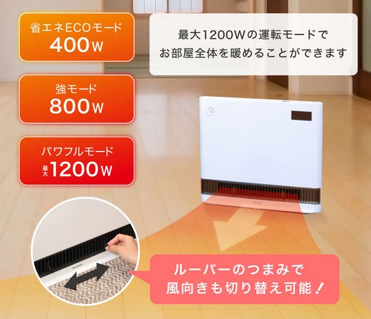 ■ヒーターのモード3つ+送風モードの合計4モード搭載ヒーターは3段階(省エネECOモード400w、強モード800w、パワフルモード最大1200w)で切り替えることができます。また、送風モードも搭載しているので、寒い季節に限らず一年中お使いいただくことができます。