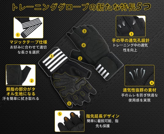 手の甲にはメッシュ素材と通気穴を設計し、汗を素早く吸収・乾燥。指先は延長設計されており、濡れた手でも簡単に脱着可能です。親指部分の柔らかいタオル生地でトレーニング中に素早く汗を拭き取れます。夏場や高強度トレーニングでも蒸れ知らずで快適に使用できます。