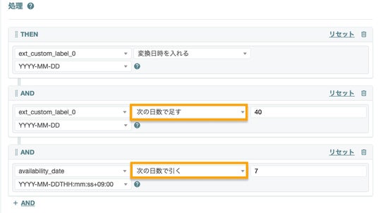 - - 例:変換日時の 5 日後の日付を入荷予定日 [availability_date] に入れる