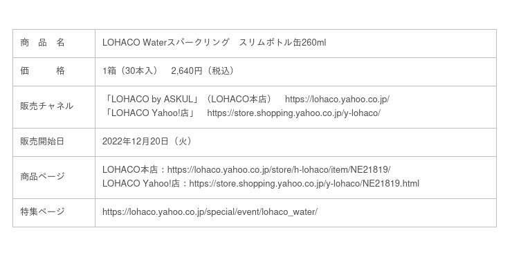 アスクル株式会社(本社:東京都江東区、代表取締役社長:吉岡晃、以下「アスクル」)が運営する一般消費者向け(BtoC)インターネット通販サービス「LOHACO」(ロハコ、以下「LOHACO」)は本日12月20日より、シリーズ初のアルミ缶ボトルのオリジナル炭酸水「LOHACO Waterスパークリング スリムボトル缶260ml」(1箱30本入)を発売します。