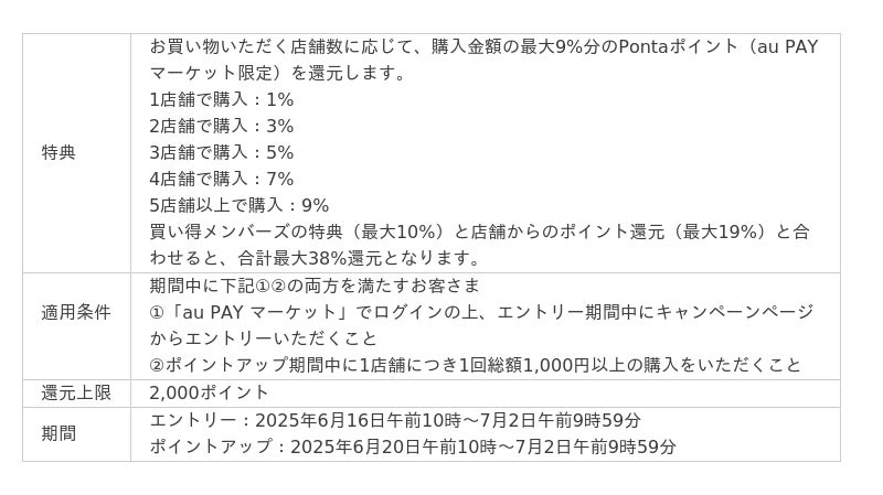 本キャンペーンでは、購入店舗数に応じて購入金額の最大9%のPontaポイント(au PAY マーケット限定)を還元します。ご購入の店舗が増えるごとにポイント還元率がアップし、既存特典とあわせて最大38%のポイント還元となります。