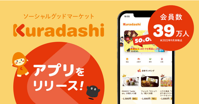 ソーシャルグッドマーケット「Kuradashi」を運営する株式会社クラダシ(本社:東京都品川区、代表取締役社長:関藤竜也、以下「クラダシ」)は、10月13日に「Kuradashi」のiOS版ならびにAndroid版アプリをリリースしましたことをお知らせいたします。