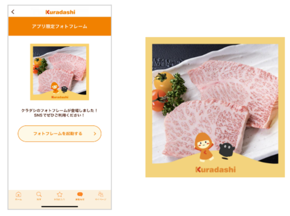 Kuradashiアプリでは、最新情報や新たなキャンペーンがスタートした際にプッシュ通知でお知らせが届くほか、Kuradashiオリジナルキャラクター「フー」と「ドロス」が登場するフォトフレーム機能をご利用いただけます。