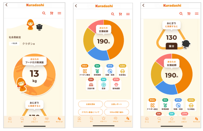 フードロス削減を目指し、まだ食べられるにも関わらず捨てられてしまう可能性のある商品を、おトクに販売しています。さらに、売上の一部を環境保護・災害支援などに取り組む様々な社会貢献活動団体に寄付し、SDGs17の項目を横断して支援しています。楽しくておトクなお買い物が、社会に良いことに繋がる。そんな、全く新しいソーシャルグッドマーケットを創出しています。またKuradashiは、2022年9月時点で利用者数は39万人、パートナー企業数は1085社を突破しました。