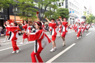 当社は、本社を構える地元福岡を盛り上げ、皆さまに日頃の『感謝』をお届けすることを目的に、毎年「新日本製薬どんたく隊」を結成し、2009年からパレードに出場しています。今年も総勢100名を超える隊列で、曲目「日本全国福の神~ふくこいバージョン~」にのせた「よさこい」を笑顔で披露し、どんたく広場(明治通り呉服町~天神間)を練り歩きました。