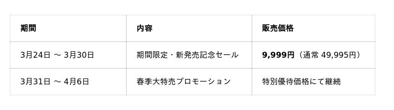 新製品の発売と春の行楽シーズンを祝し、期間限定の特別価格でご提供いたします。