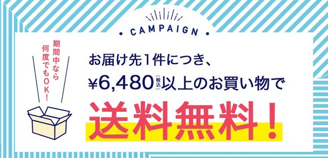お届け先1件につき、商品代金6,480円(税込)以上ご購入で、送料が無料となるキャンペーンを開催中です。 期間中は何度でもご利用いただけます。この機会にぜひお買い物をお楽しみください。
