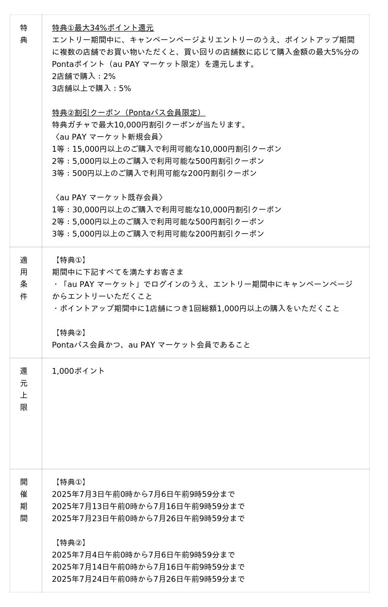 Pontaポイントを「au PAY マーケット」のお買い物限定ポイントに最大1.5倍増量できる「お得なポイント交換所」、生放送の商品紹介で視聴者と出演者が双方向にコミュニケーションできる「ライブTV」などでお買い物をおトクにお楽しみいただけます。