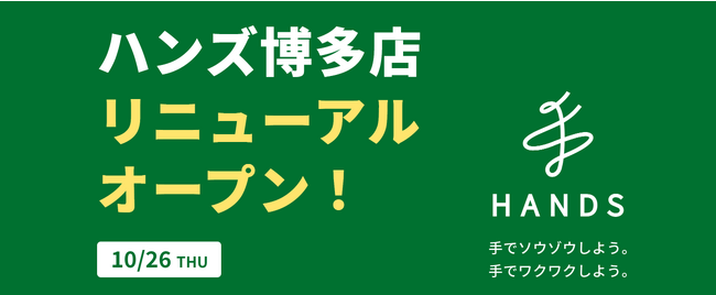 新生ハンズのブランドメッセージである「手でソウゾウしよう。手でワクワクしよう。」をお客様に感じていただくハンズのフラッグシップ店舗として、これまで以上に地域に愛されるお店として博多店をリニューアルします。